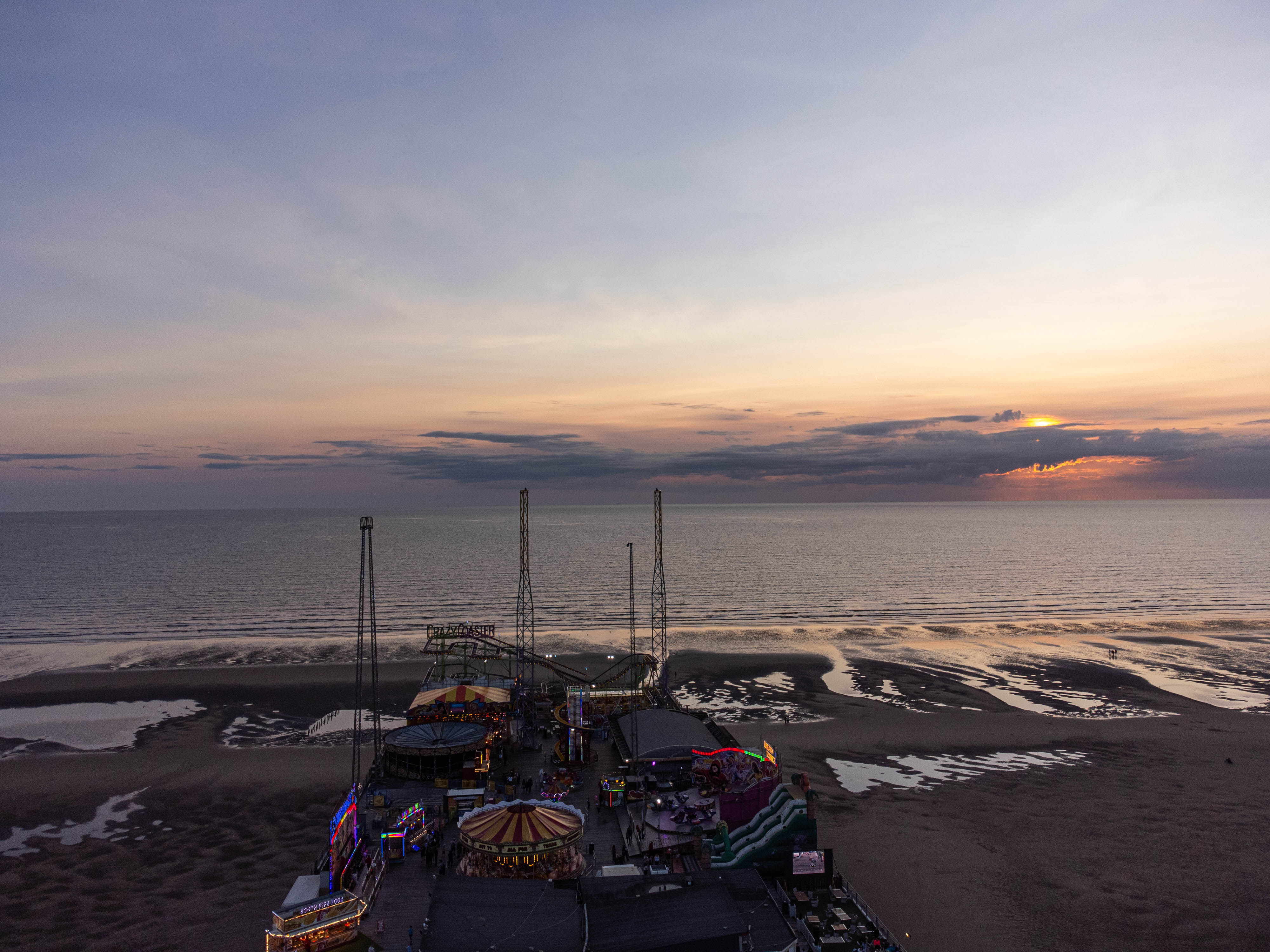 Unlike the more open North Pier, South Pier's deck is packed. A drone flight reveals a patchwork of arcades, the Crazy Mouse spinning coaster, and a Waltzer, creating a vibrant, rotating mechanical landscape.