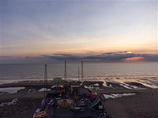 As you fly toward the end of the pier, the most striking features are the tall structures of the Adrenaline Zone. From above, you can capture the Skycoaster freefalling swing (38m high) and the Skyscreamer reverse bungee, which provide high-speed vertical movement against the backdrop of the Irish Sea.