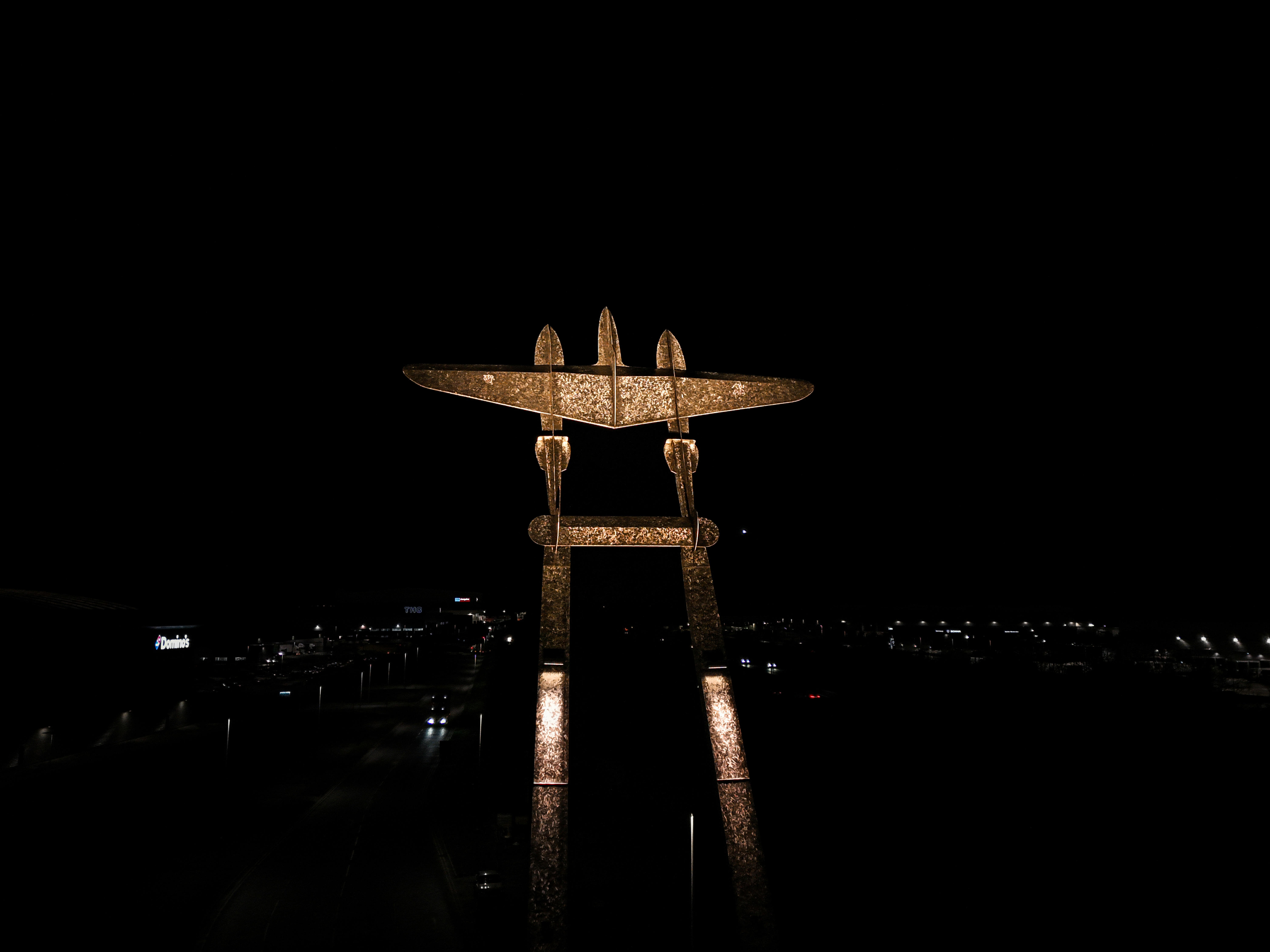 The sculpture depicts a Lockheed P-38 Lightning fighter aircraft appearing to soar into the sky from a steep dive, leaving dynamic steel "trails" behind it.