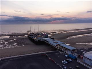 Unlike the more open North Pier, South Pier's deck is packed. A drone flight reveals a patchwork of arcades, the Crazy Mouse spinning coaster, and a Waltzer, creating a vibrant, rotating mechanical landscape.