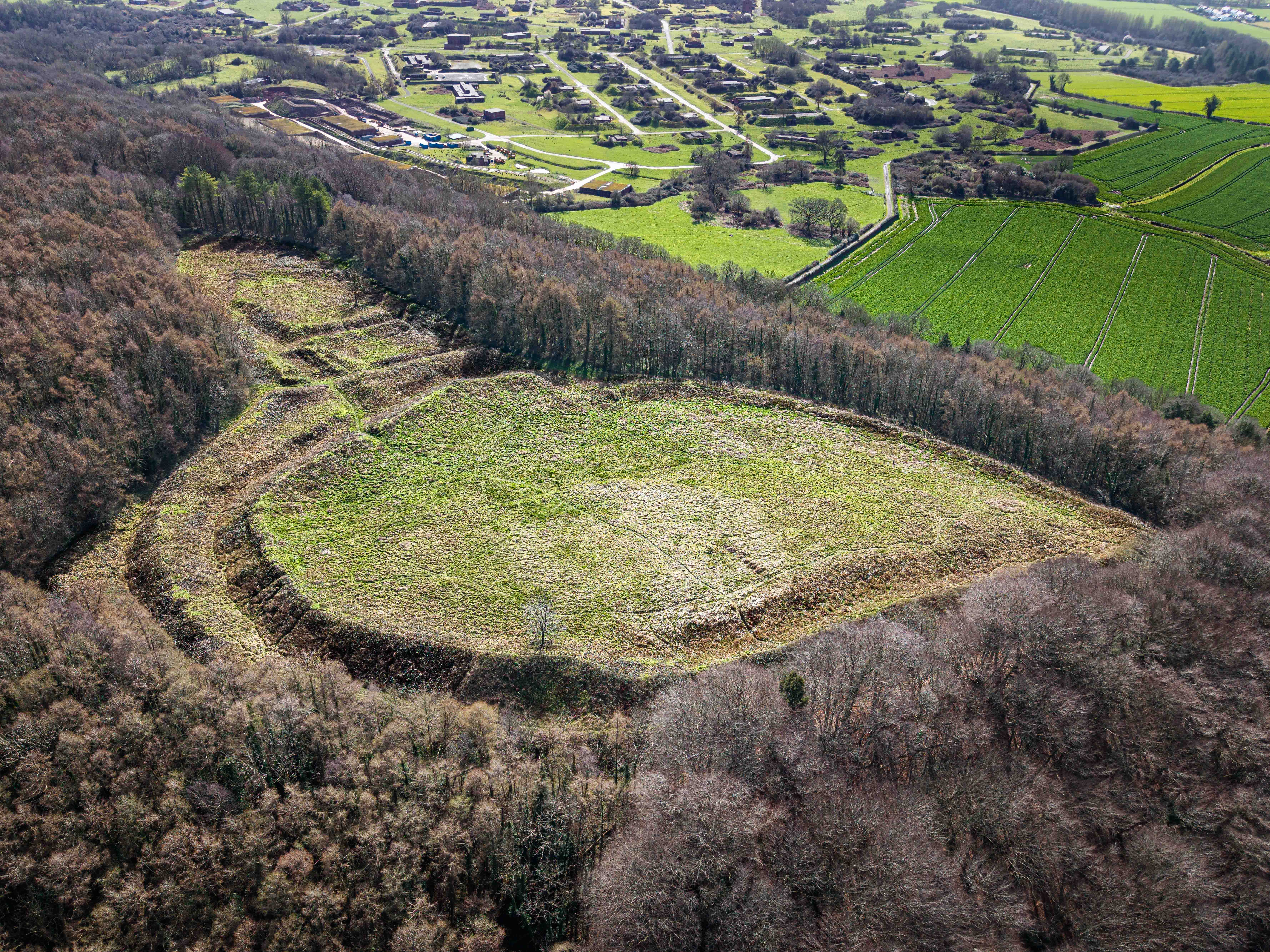 Constructed around the 4th century BC, the site consists of a main elliptical enclosure and a distinctive "annexe" to the southeast, clearly visible in the images as the lower terraced area extending into the treeline.