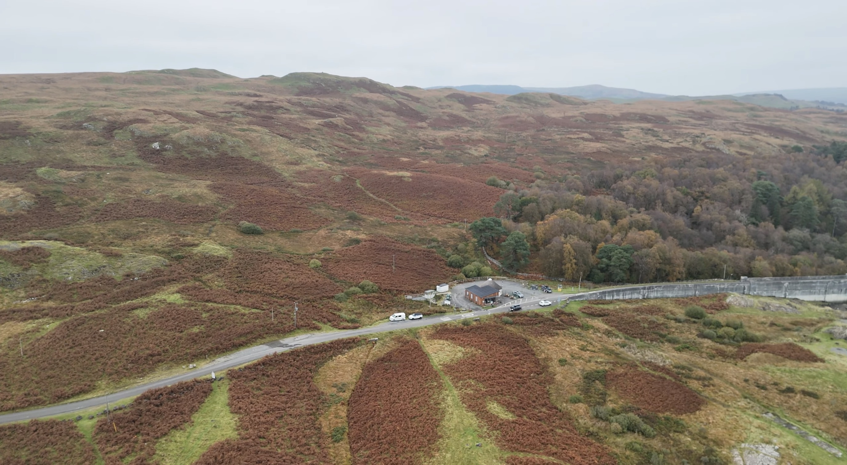 The area marked on the map is just a large tarmacked area off the road, large enough for three cars. The road is single track with passing places and the main access to the reservoir head. Probably not suitable for motorhomes.
