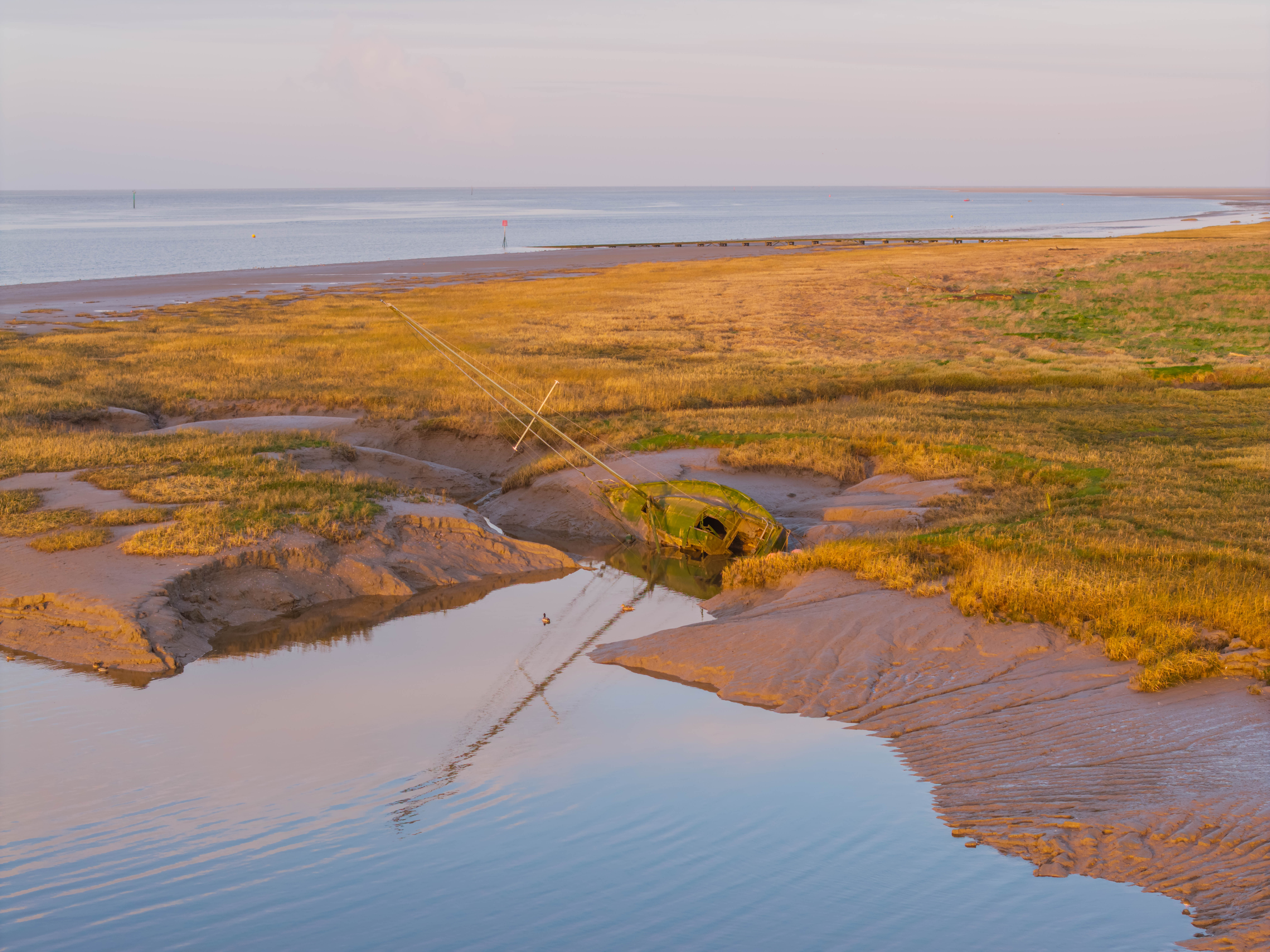 The jetty is a premier spot for sunset flights, as the low light casts long shadows and turns the Ribble Estuary into a reflective surface of golds and purples.