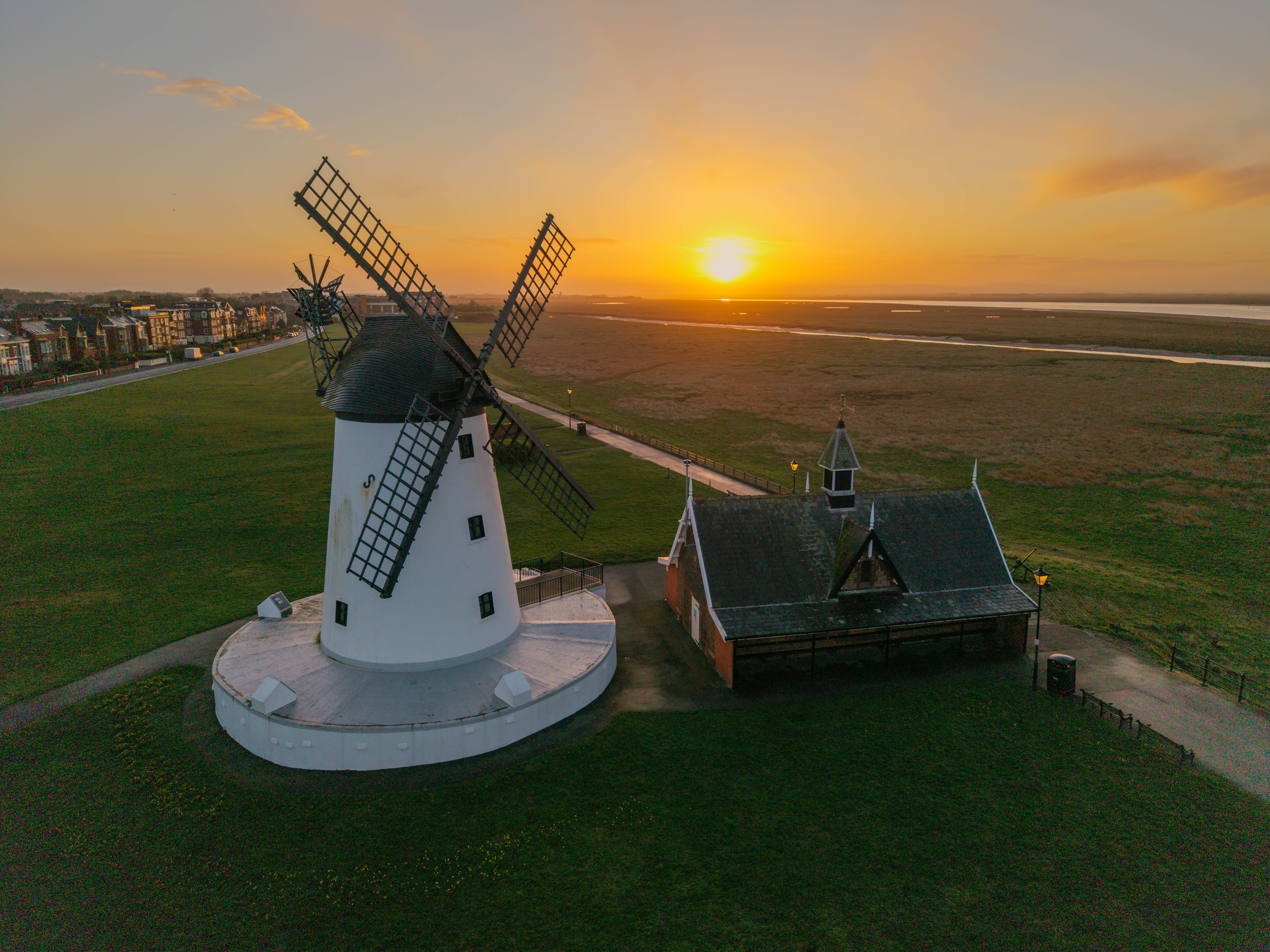 Climbing to a higher altitude reveals the broader landscape, including the Lytham Windmill to the east and views across the water toward Southport and the North Wales coastline.