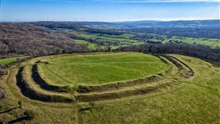 Today, the site is a National Trust-owned SSSI, where the thin limestone soils support rare wildflowers and butterflies. The low-angled sunlight in the photo highlights the single and double earth banks, showing why this is still one of the best-preserved hillforts in South West England.