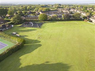 A large sports field with extensive facilities and a lovely old church hidden in the trees