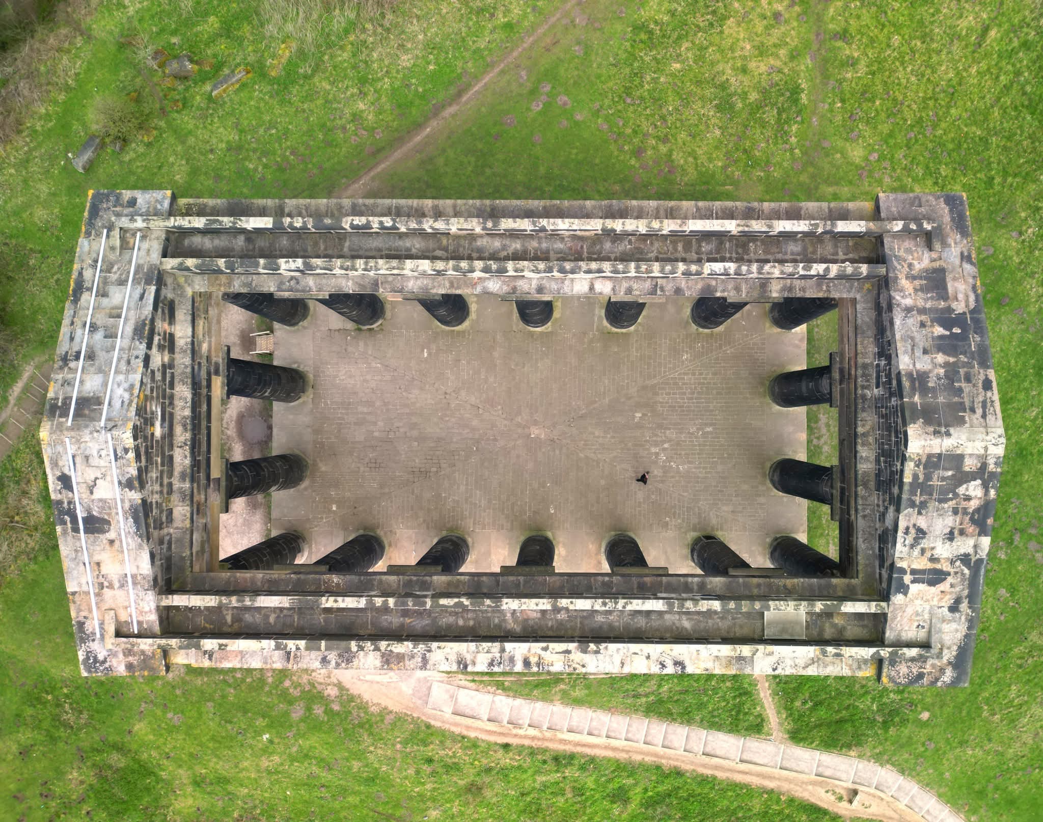 The wide-angle shot showcases the obelisk’s role as a "focal point" of the landscape. It was designed to be seen from Eastnor Castle, anchoring the vista between the Malvern Hills and the undulating Herefordshire countryside. In the shot it is framed against the backdrop of Midsummer Hill, linking 19th-century commemorative architecture with the Iron Age landscape.