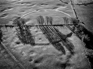 The main photograph captures the southern circles, highlighting how these ancient earthworks persist as subtle "ghosts" in the modern landscape. The low winter sun creates long shadows that emphasize the undulating banks and depressions that are largely invisible from the ground.