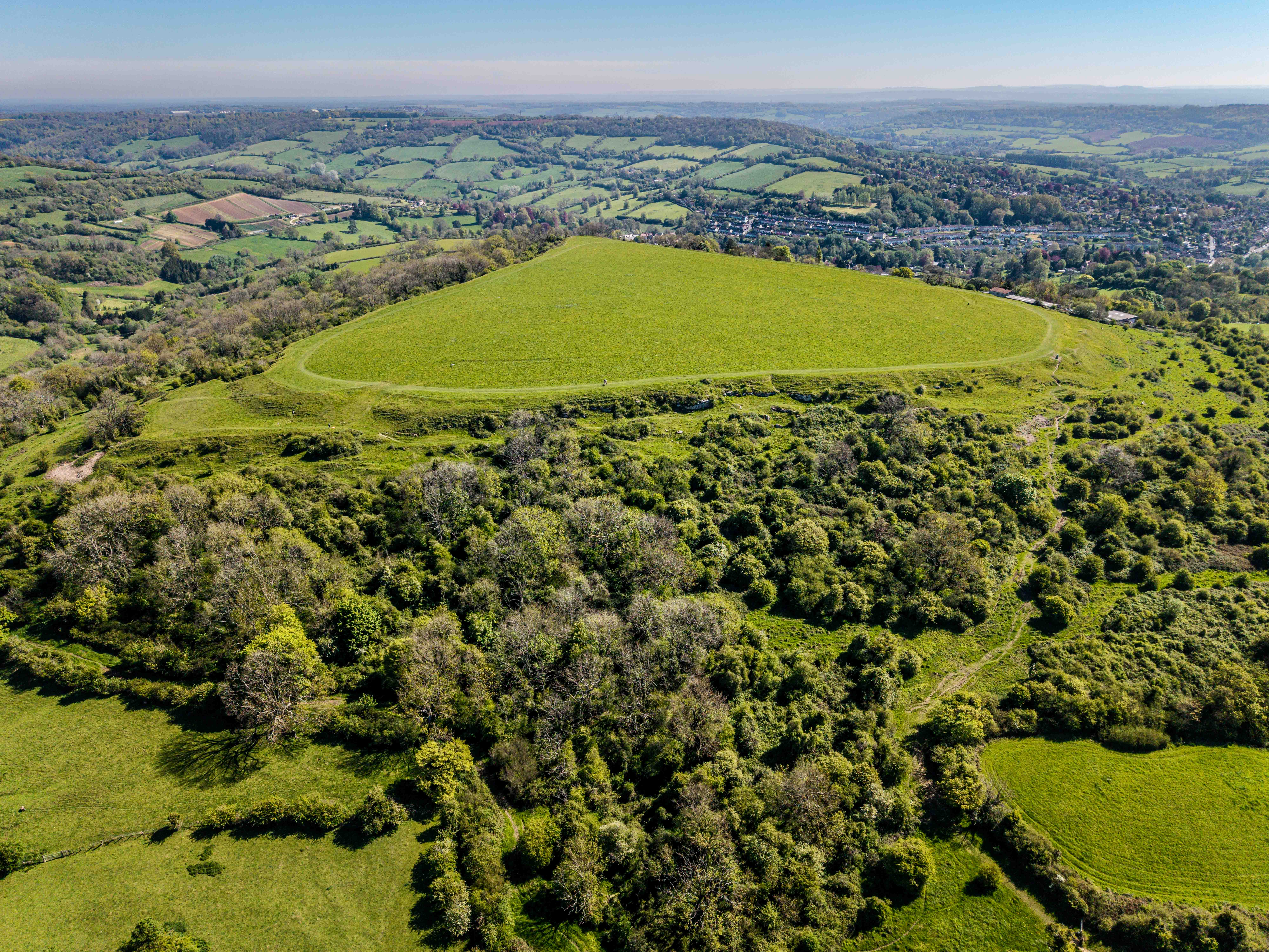 These aerial perspectives offer a striking masterclass in Iron Age engineering and the strategic use of topography. Hinton Hill Fort (also known as Dyrham Camp) occupies a commanding 240-meter limestone spur of the Cotswold Edge in Gloucestershire. Its primary defensive feature—a massive, single ditch and bank—is most visible where the low morning sun casts deep shadows that emphasise the surviving earthworks.