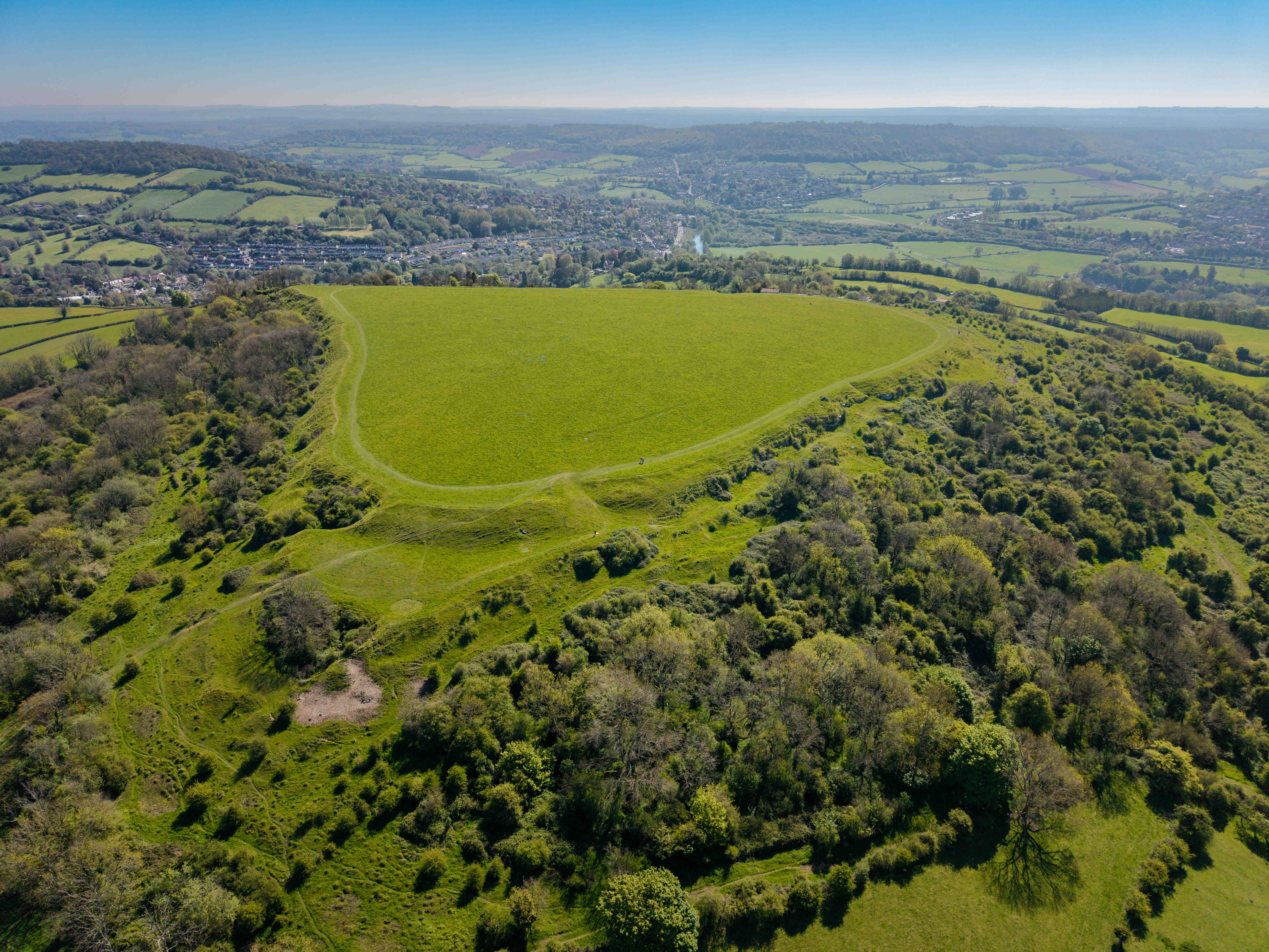 The images show how the ancient site is now integrated into the English pastoral landscape. The Cotswold Way passes through these ramparts, while modern roads and field boundaries now dissect the periphery of what was once a secure tribal capital.