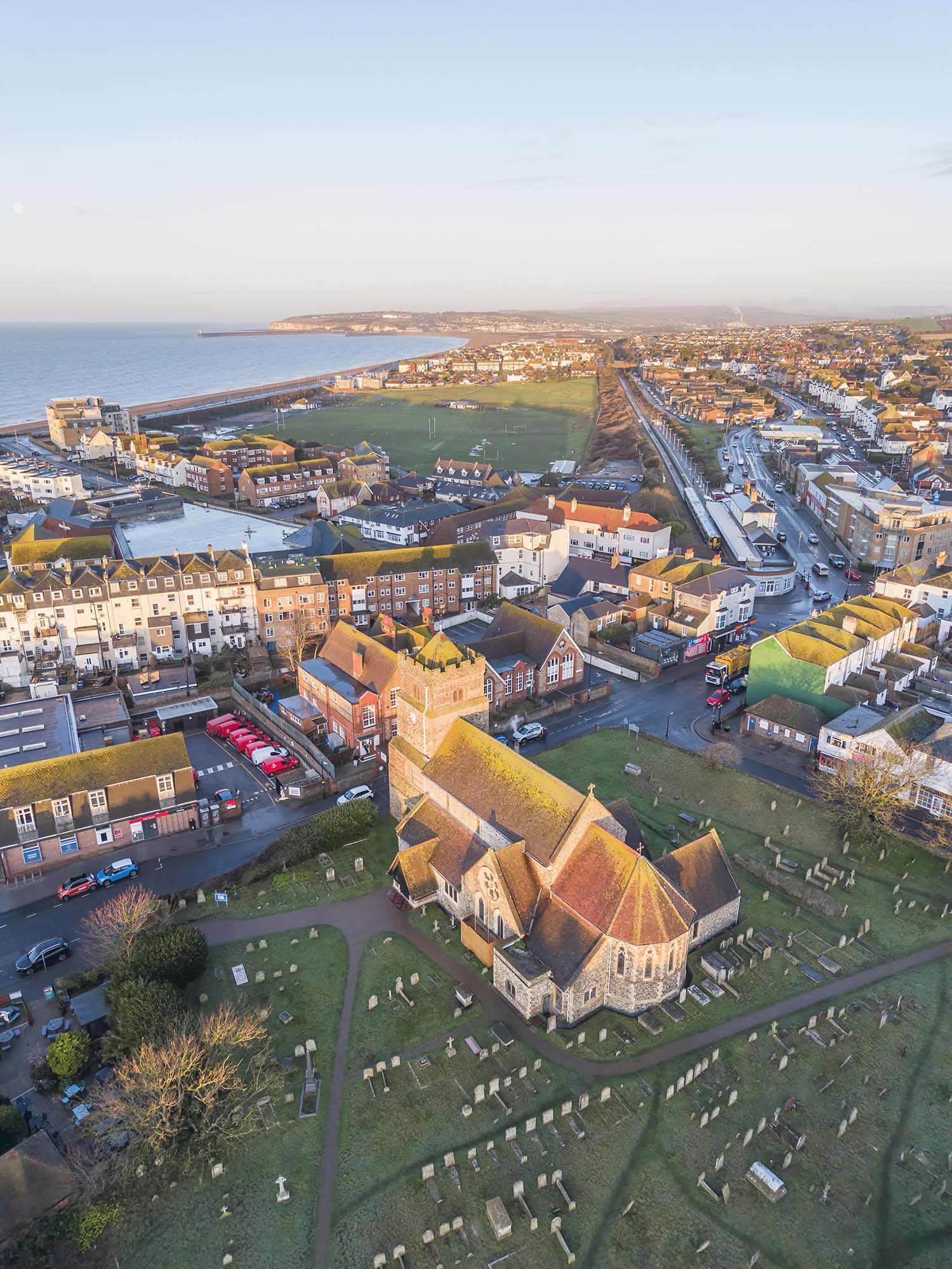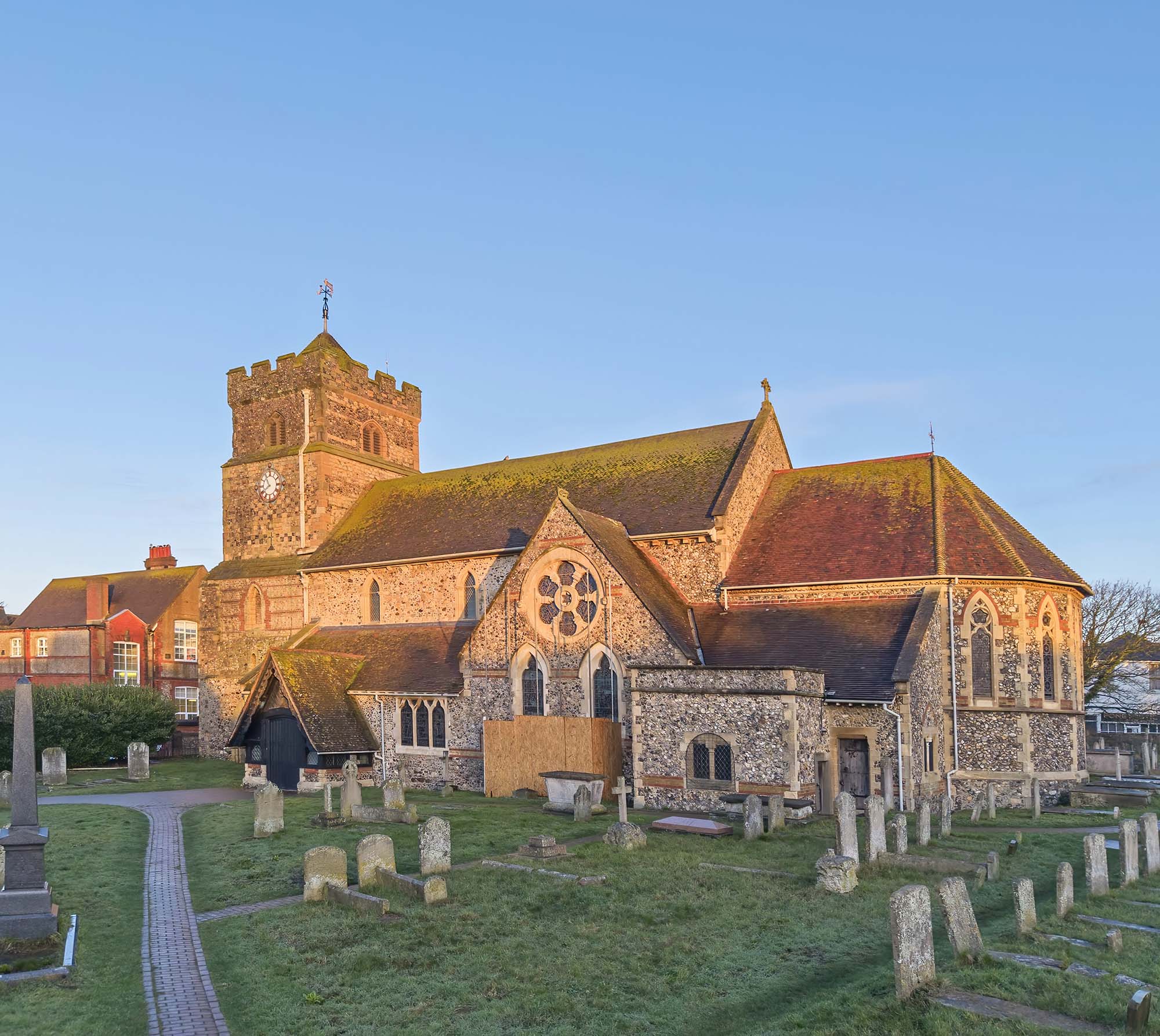 Dating from around 1100 the town centre parish church of St Leonards is a grade 1 listed building in Seaford East Sussex. There are distant views of the coast from the churchyard. There is on street parking around the church