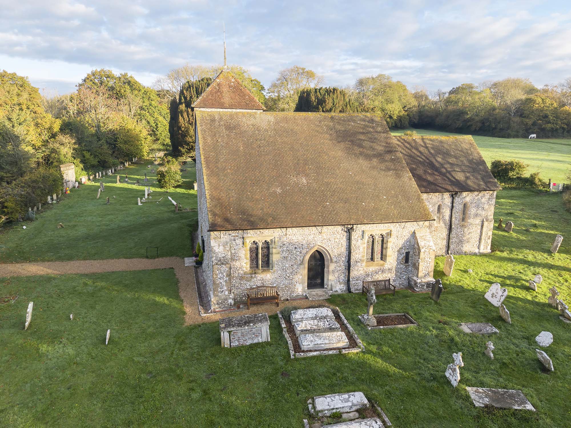 St Andrew-by-the-Ford is a tiny church of Saxon origin, at the end of a small gravel path, close to the bank of the River Arun and surrounded by a copse of trees. The church originally served a small community which was abandoned in 1608.