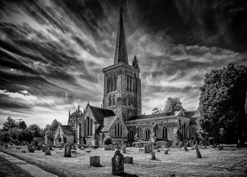 The accompanying photograph captures the church’s commanding presence within its historic churchyard, revealing the cruciform plan, the central tower and spire, and the long-settled burial ground that encircles it.