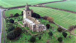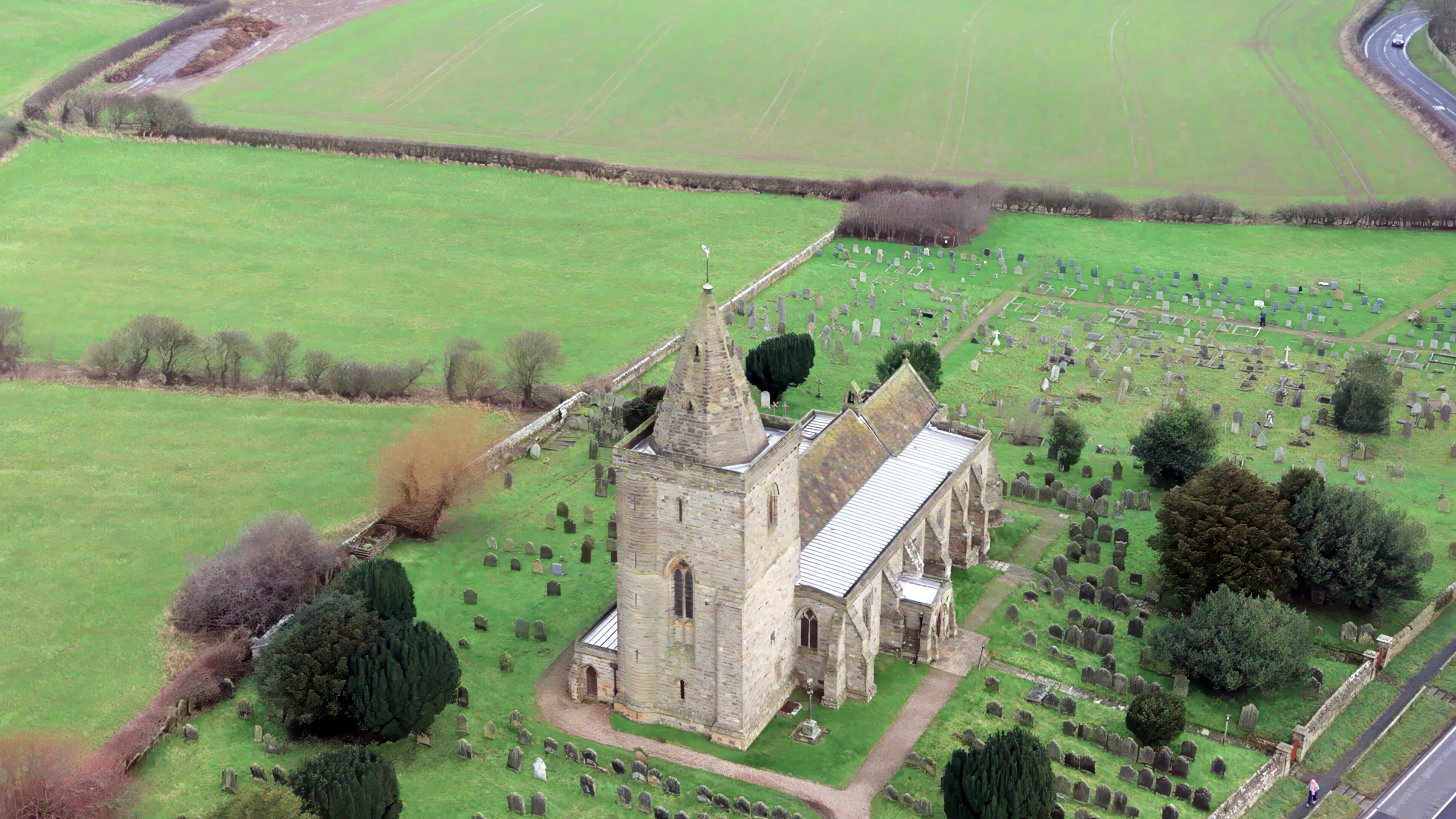 This elevated perspective highlights how the church has served as both a spiritual and geographical anchor for the surrounding rural community for nearly a millennium.