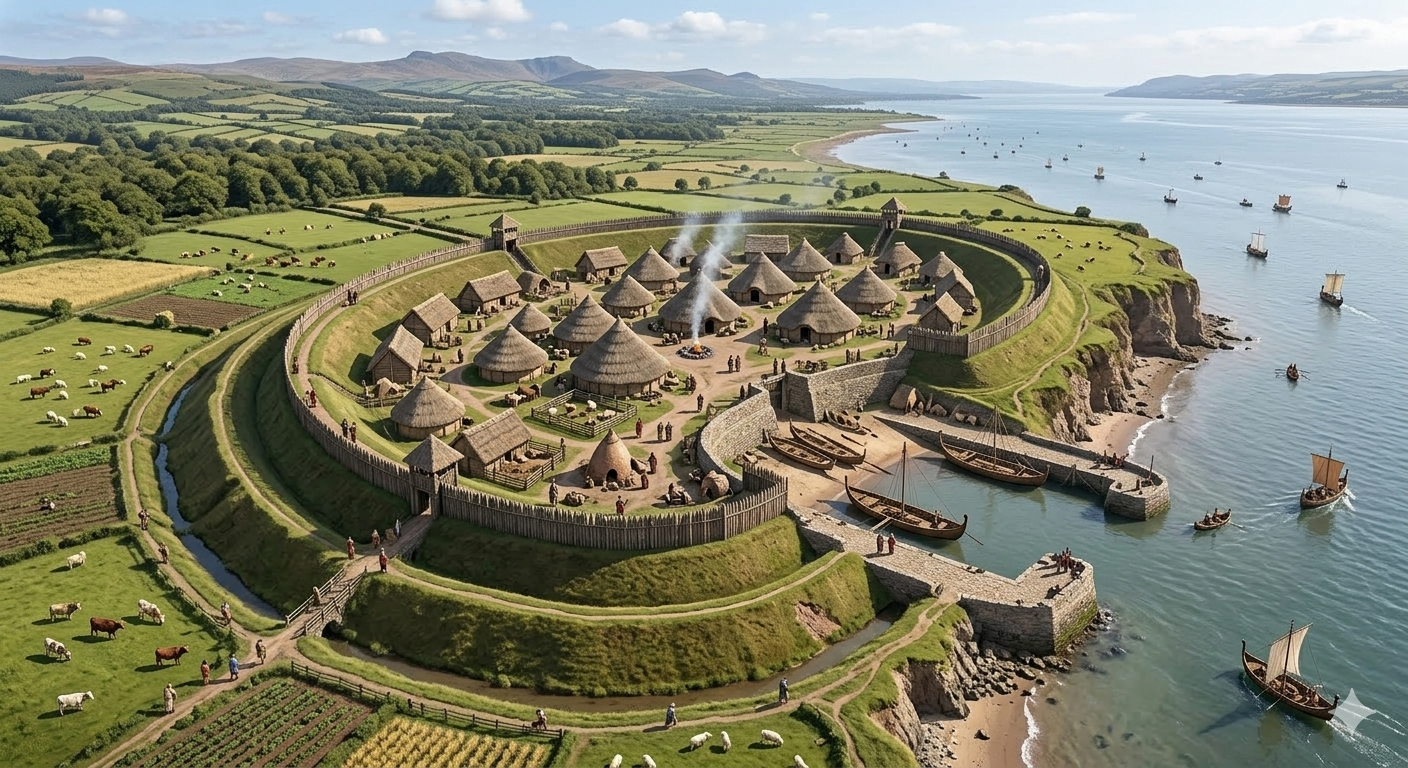 Traces of glass and metal manufacturing were discovered within the interior (the area that is now a football pitch in the photos). This suggests the community wasn't just farming; they were skilled artisans engaging in maritime trade.