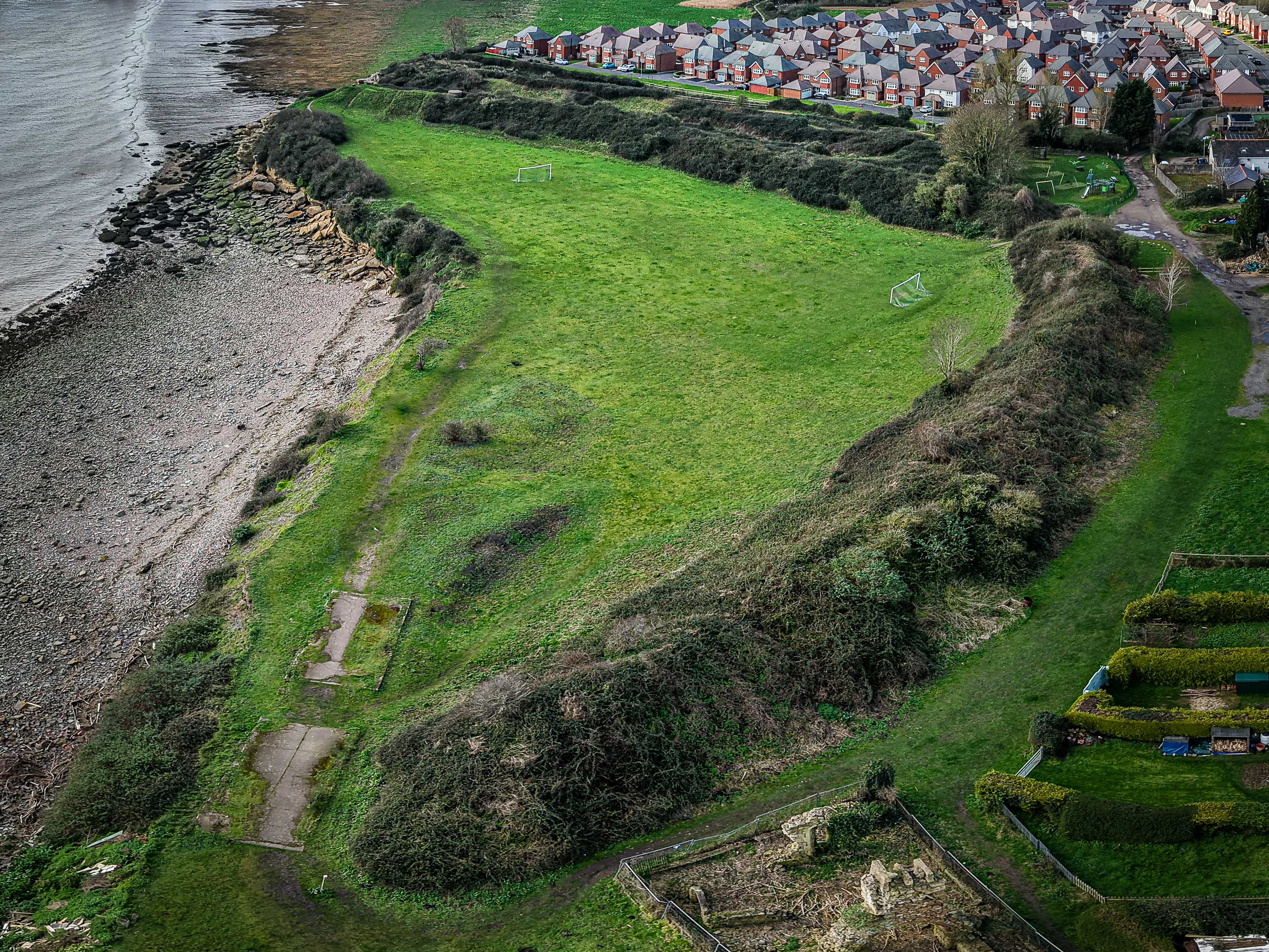 The shots clearly illustrate the fort's greatest threat – coastal erosion. Over centuries, the Severn has reclaimed the southern half of the settlement; you can see the ramparts now terminating abruptly at the cliff edge.