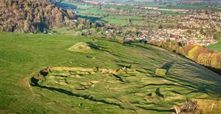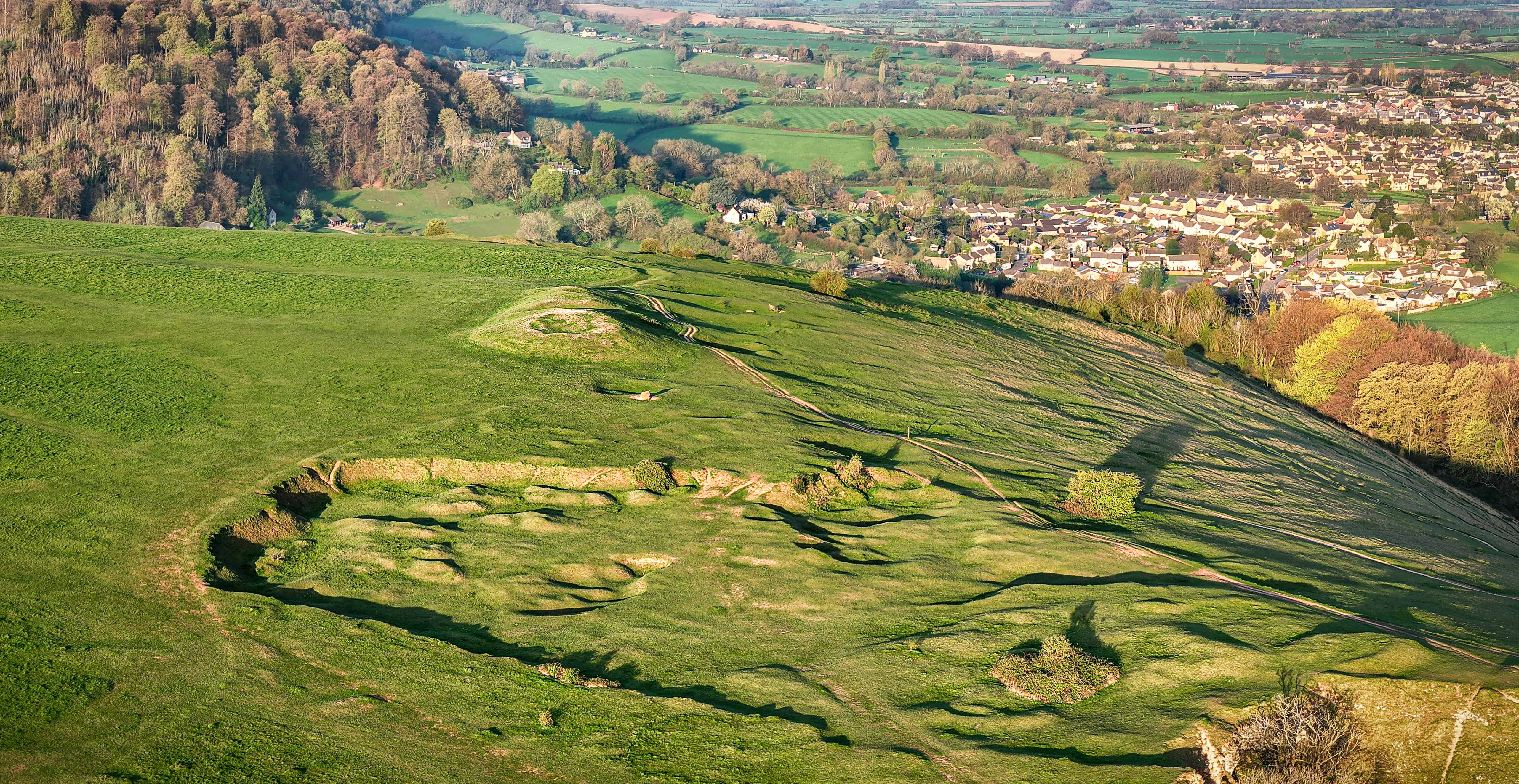 The photographs capture the scale of these multiple parallel ramparts which wrap dramatically around the contours of the hills. These defences showcase sophisticated Iron Age engineering and a formidable statement of power that is still clearly legible.