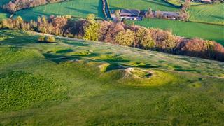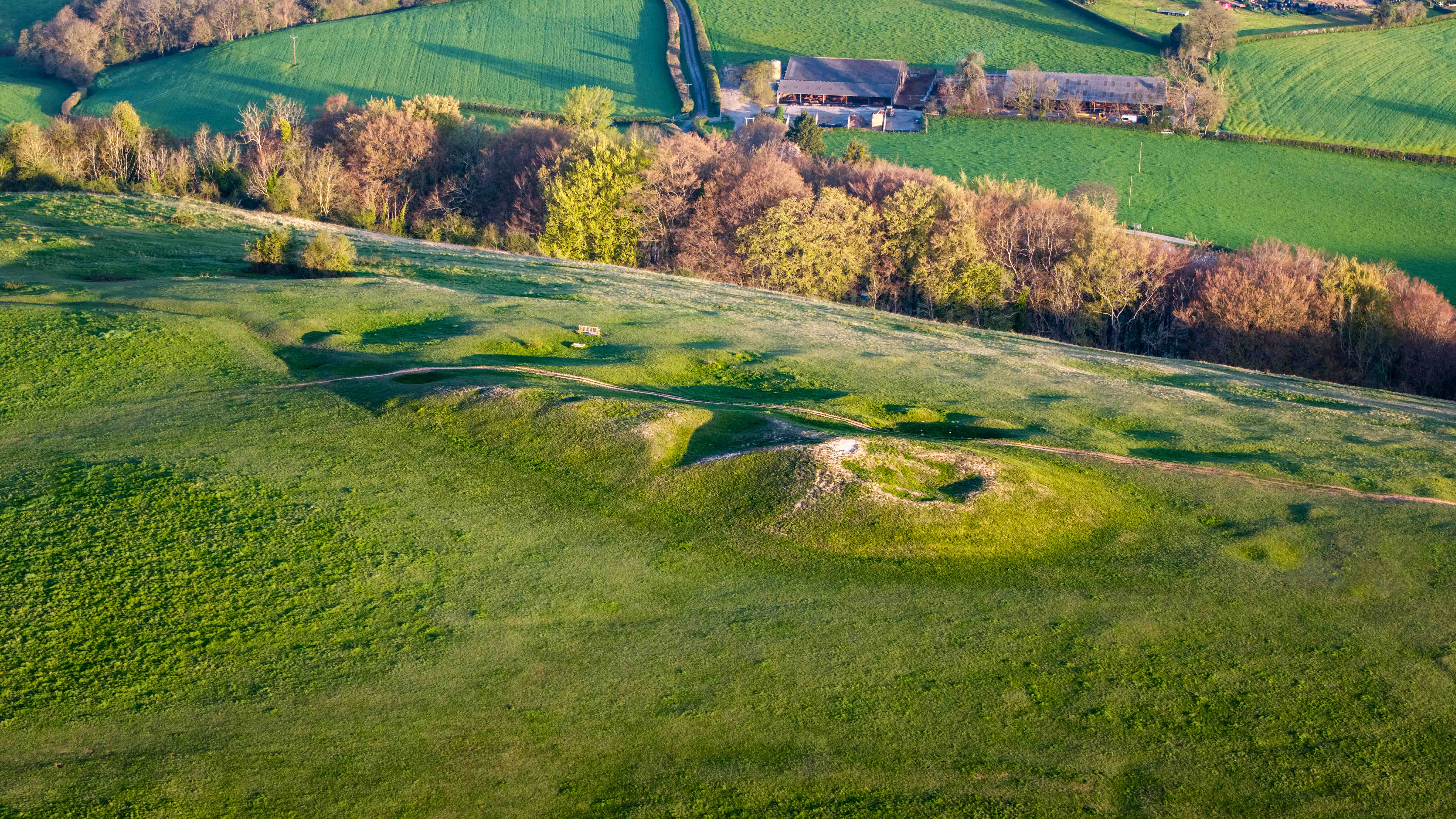 The close-up drone shots reveal the undulating surface of the mound. While it remains one of the largest in Gloucestershire, the depressions in the centre are the result of unrecorded "treasure hunting" or early antiquarian digs in the 18th and 19th centuries.