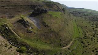 These aerial perspectives offer a striking masterclass in Iron Age engineering and the strategic use of topography. Hinton Hill Fort (also known as Dyrham Camp) occupies a commanding 240-meter limestone spur of the Cotswold Edge in Gloucestershire. Its primary defensive feature—a massive, single ditch and bank—is most visible where the low morning sun casts deep shadows that emphasise the surviving earthworks.