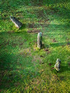 Just a short flight away are Harold's Stones -a striking trio of Bronze Age standing stones forming a 12 metre alignment, each one leaning at a different angle—likely due to subsidence or centuries of disturbance rather than intentional design.