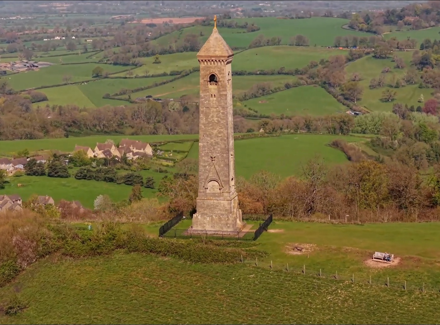 The wide-angle shot showcases the obelisk’s role as a "focal point" of the landscape. It was designed to be seen from Eastnor Castle, anchoring the vista between the Malvern Hills and the undulating Herefordshire countryside. In the shot it is framed against the backdrop of Midsummer Hill, linking 19th-century commemorative architecture with the Iron Age landscape.