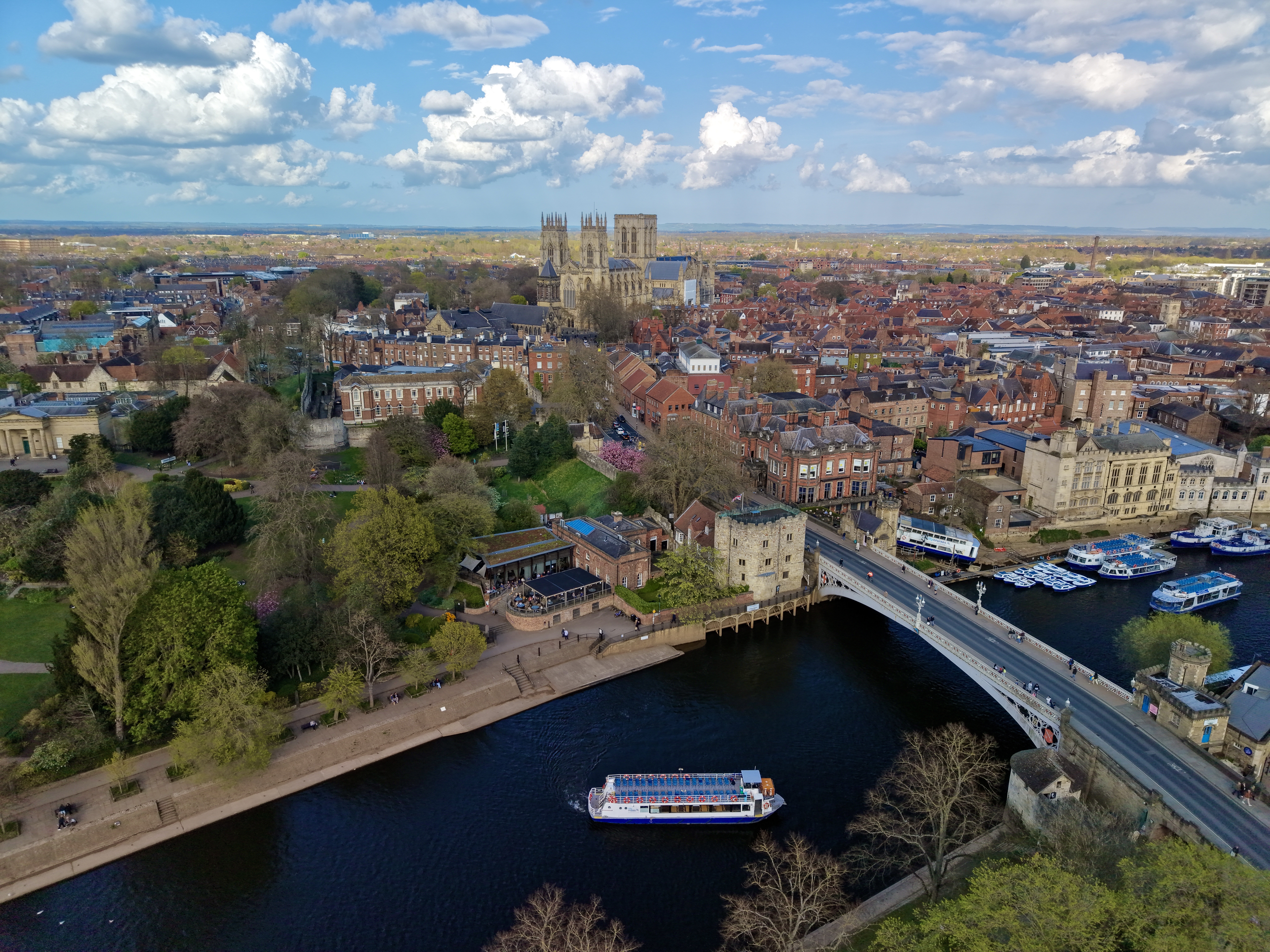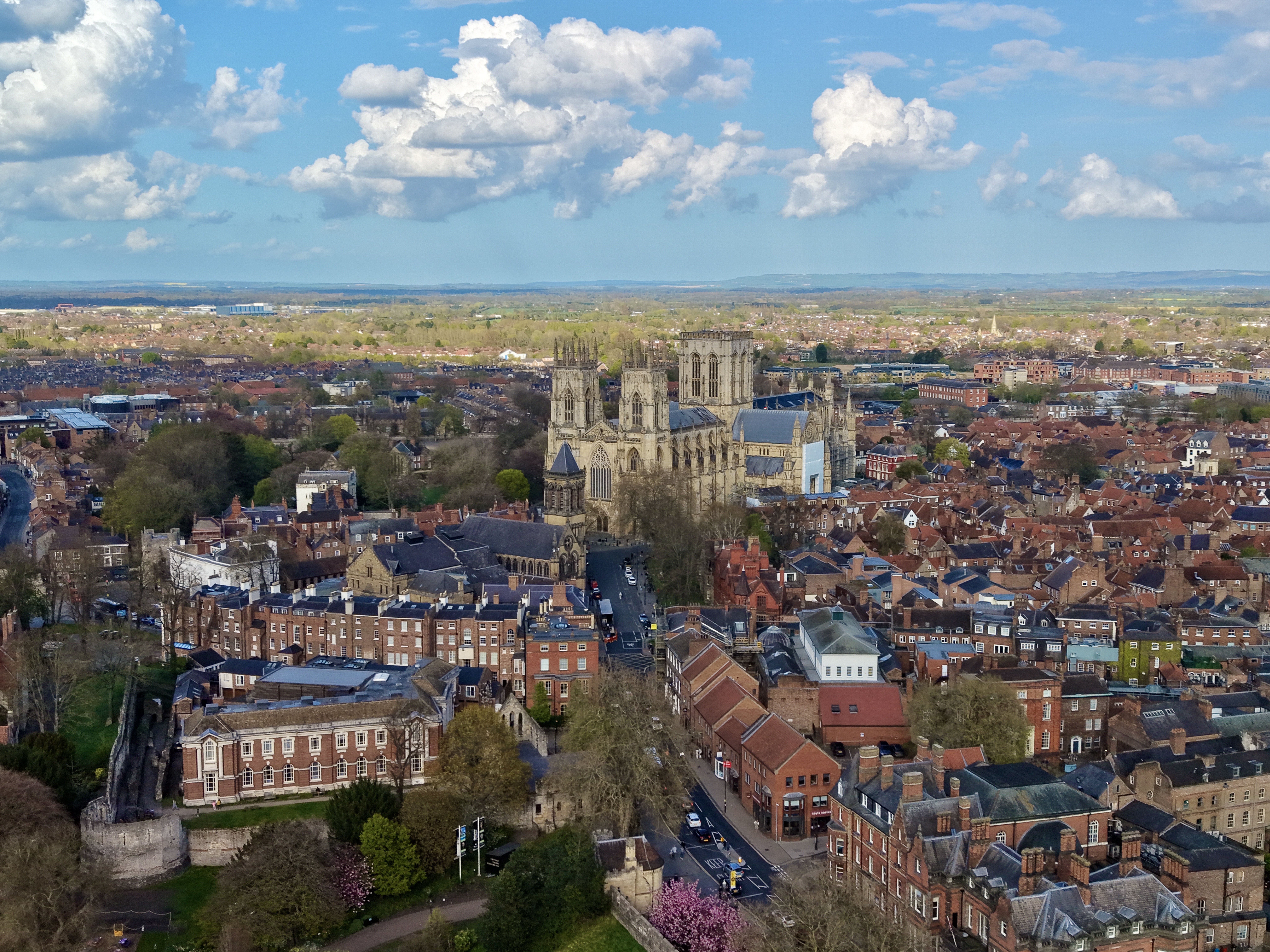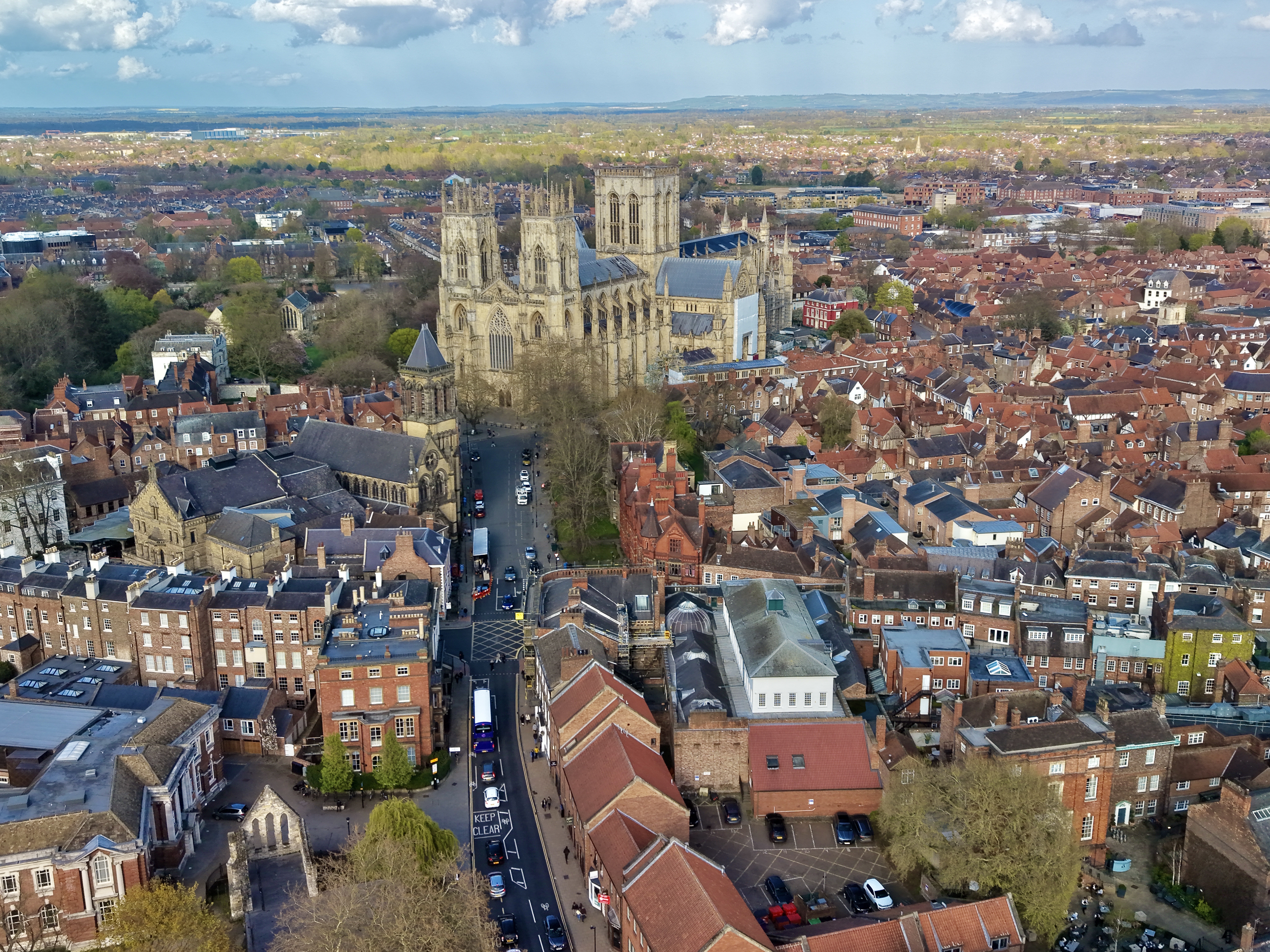The park adjacent to the minster is owned by the minster and they have signs saying no drones. I flew from the street by the front entrance and was able to fly and maintain VLOS. the parking marker I have placed